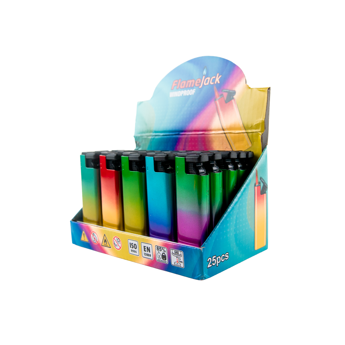 A premium windproof lighter that combines reliable performance with eye catching metallic finishes. These Flamejack lighters are built to withstand the elements whilst delivering consistent ignition every time, making them a must stock item for any retailer looking to offer quality smoking accessories with standout visual appeal.